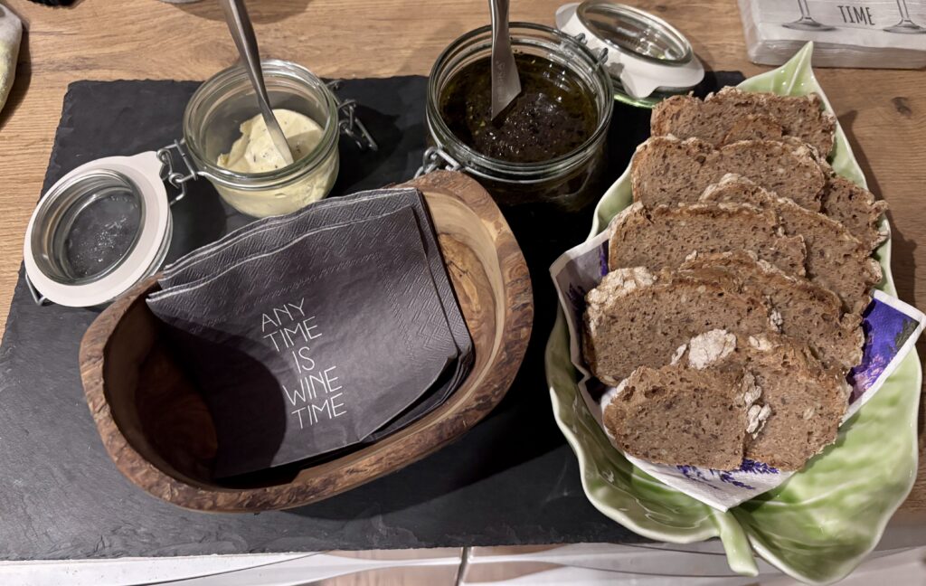- Selbstgemachter Olivenaufstrich und Trüffelbutter mit selbstgebackenem Vollkorn-Zupfbrot